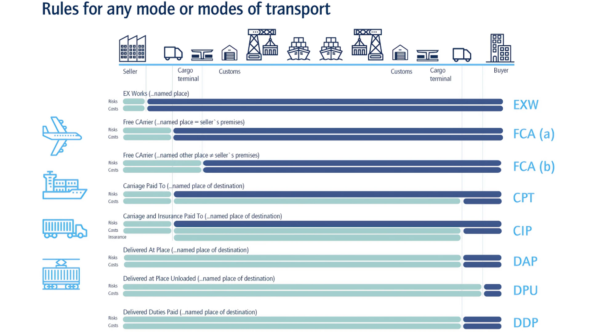 Incoterms terimleri taşıma modlarına göre farklılık göstermektedir. Belirli taşıma şekillerinde sadece belirli terimler geçerlidir. Bunlar şu şekilde sıralanabilir: